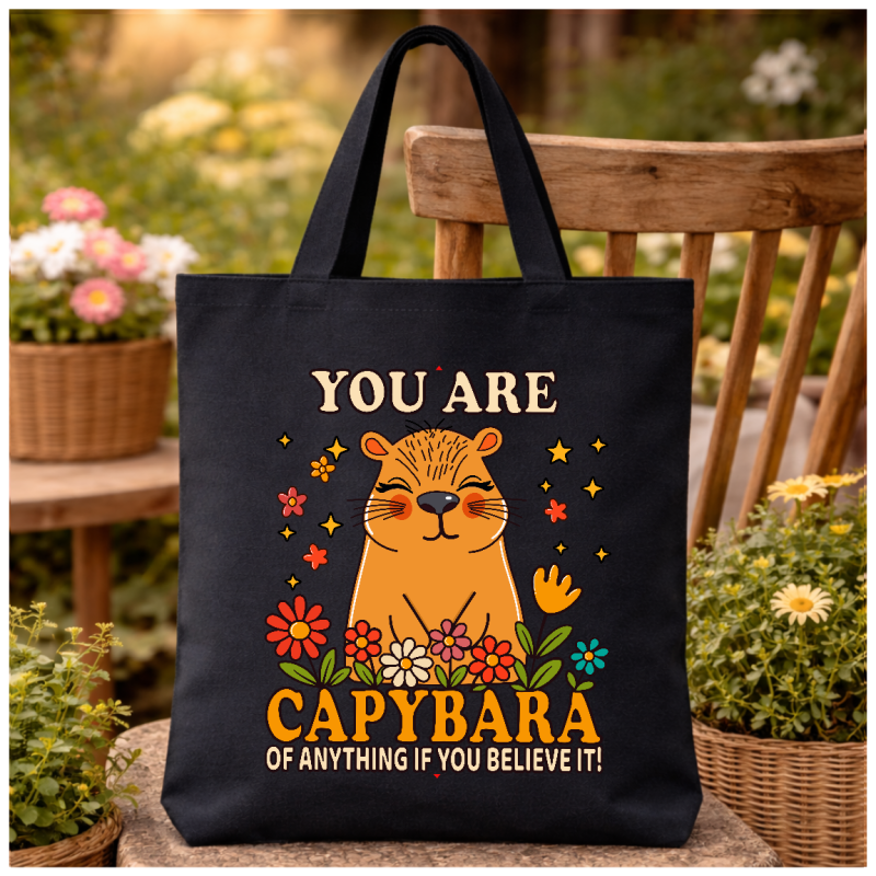 Carry confidence wherever you go with this cheerful capybara-inspired tote! Featuring a sweet capybara surrounded by bright blooms and good vibes, this bag delivers a playful reminder that you are capybara of anything—yes, anything—if you believe it.