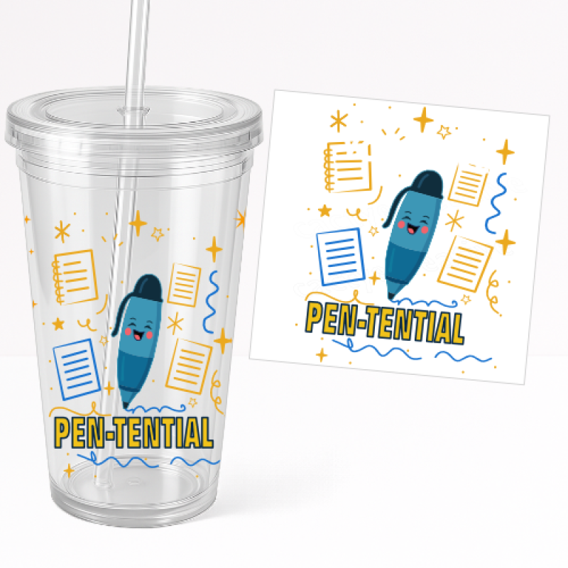 Bring a little joy to your everyday items with our “You Have Pen-Tential” UV DTF sticker! This high-quality, ready-to-apply sticker features a smiling blue pen character with rosy cheeks, surrounded by colorful elements like notebooks, papers, stars, and squiggly lines—paired with a playful message to brighten your day.