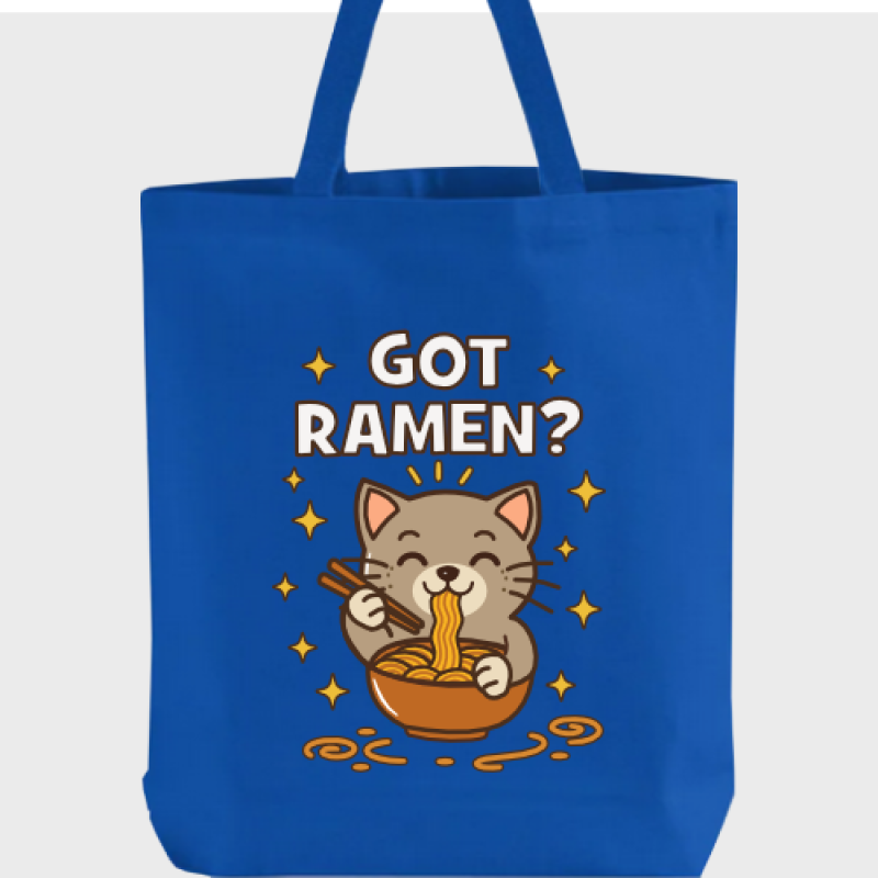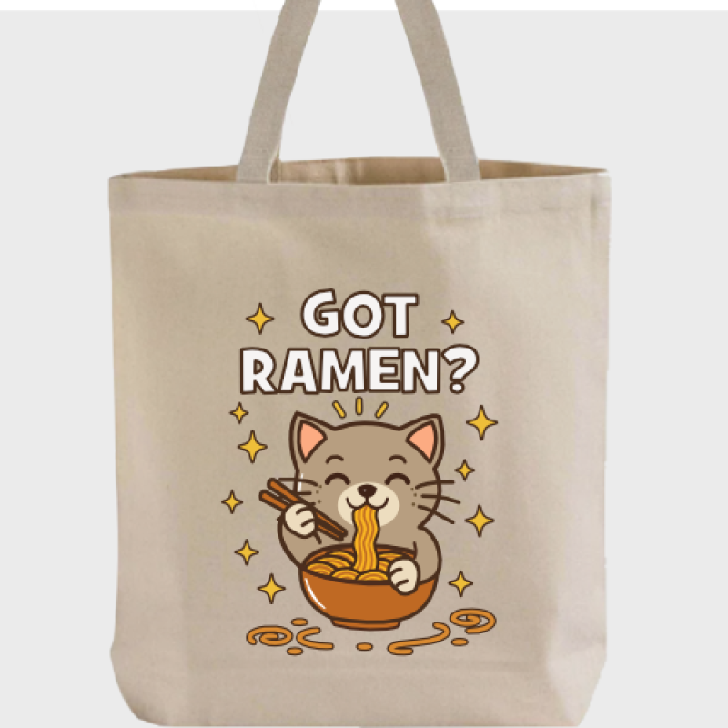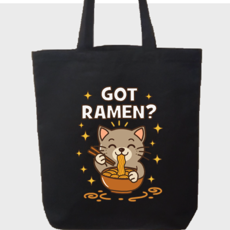 Calling all ramen lovers and cat enthusiasts—this tote is made just for you! Featuring an adorably hungry kitty happily slurping up a bowl of noodles, paired with the playful "Got Ramen?" text, this bag is the perfect blend of cuteness and foodie fun.