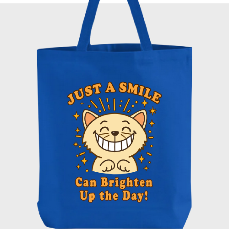 Carry positivity wherever you go with this heartwarming tote! Featuring an adorable cat with the biggest, happiest smile, this design radiates pure joy. Paired with the uplifting message “Just A Smile Can Brighten Up The Day,” it’s the perfect pick for cat lovers and anyone who believes in the power of kindness.