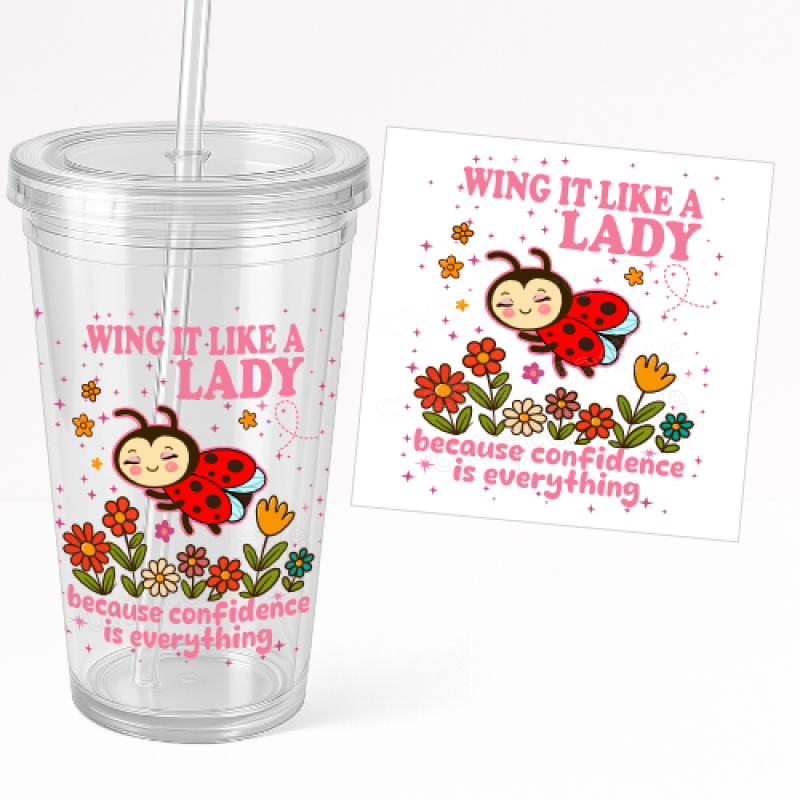 Bring a little joy to your everyday items with our “Wing It Like a Lady” UV DTF sticker! This high-quality, ready-to-apply sticker features a smiling ladybug character with rosy cheeks and colorful wings, surrounded by vibrant flowers and playful elements like stars and sparkles—paired with an empowering message to boost your confidence.